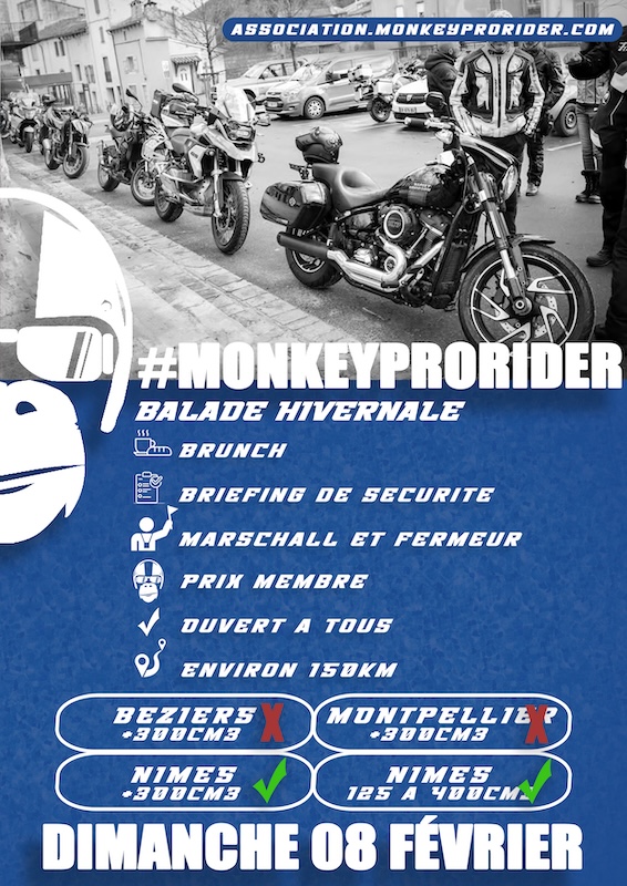 Les balades #MONKEYPRORIDER se veulent bon-enfant et conviviales. Les rythmes sont raisonnables pour la sécurité de tous. Les motos doivent être bien entretenue et à jour des consommables. Si vous avez un doute sur l’état des plaquettes, l’usure des pneus ou autres éléments de sécurité, ne prenez pas le départ. Les motos doivent respecter le niveau sonore légal. Il est demandé aux participants de baisser les gazs lors des traversées d’agglomérations. Les rupteurs, wheeling et autres attitudes négatives mèneront à l’expulsion du participant. Chacun est responsable de son permis de conduire. Chacun doit contrôler sa vitesse. Chacun doit être équipé au regard de la loi avec des gants et casques homologués norme CE. La team recommande néanmoins de renforcer son équipement avec des vêtements anti-abrasion, des bottes adaptées ainsi qu’une dorsale. Chaque participant devra faire preuve de bienveillance envers les autres participants, avoir une attitude respectueuse et polie. La règle #MONKEYPRORIDER est le partage et la mixité. Aussi, chacun doit faire l’effort de partager avec tous les participants. Aucun sous groupe ne sera toléré. On est #MONKEYPRORIDER !