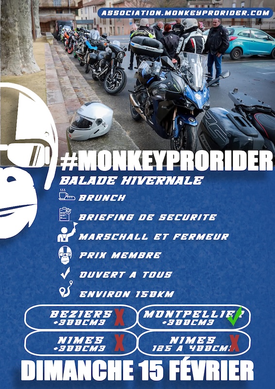 Les balades #MONKEYPRORIDER se veulent bon-enfant et conviviales. Les rythmes sont raisonnables pour la sécurité de tous. Les motos doivent être bien entretenue et à jour des consommables. Si vous avez un doute sur l’état des plaquettes, l’usure des pneus ou autres éléments de sécurité, ne prenez pas le départ. Les motos doivent respecter le niveau sonore légal. Il est demandé aux participants de baisser les gazs lors des traversées d’agglomérations. Les rupteurs, wheeling et autres attitudes négatives mèneront à l’expulsion du participant. Chacun est responsable de son permis de conduire. Chacun doit contrôler sa vitesse. Chacun doit être équipé au regard de la loi avec des gants et casques homologués norme CE. La team recommande néanmoins de renforcer son équipement avec des vêtements anti-abrasion, des bottes adaptées ainsi qu’une dorsale. Chaque participant devra faire preuve de bienveillance envers les autres participants, avoir une attitude respectueuse et polie. La règle #MONKEYPRORIDER est le partage et la mixité. Aussi, chacun doit faire l’effort de partager avec tous les participants. Aucun sous groupe ne sera toléré. On est #MONKEYPRORIDER !