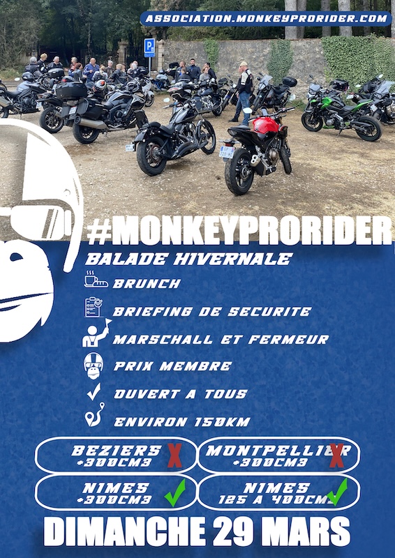 Les balades #MONKEYPRORIDER se veulent bon-enfant et conviviales. Les rythmes sont raisonnables pour la sécurité de tous. Les motos doivent être bien entretenue et à jour des consommables. Si vous avez un doute sur l’état des plaquettes, l’usure des pneus ou autres éléments de sécurité, ne prenez pas le départ. Les motos doivent respecter le niveau sonore légal. Il est demandé aux participants de baisser les gazs lors des traversées d’agglomérations. Les rupteurs, wheeling et autres attitudes négatives mèneront à l’expulsion du participant. Chacun est responsable de son permis de conduire. Chacun doit contrôler sa vitesse. Chacun doit être équipé au regard de la loi avec des gants et casques homologués norme CE. La team recommande néanmoins de renforcer son équipement avec des vêtements anti-abrasion, des bottes adaptées ainsi qu’une dorsale. Chaque participant devra faire preuve de bienveillance envers les autres participants, avoir une attitude respectueuse et polie. La règle #MONKEYPRORIDER est le partage et la mixité. Aussi, chacun doit faire l’effort de partager avec tous les participants. Aucun sous groupe ne sera toléré. On est #MONKEYPRORIDER !